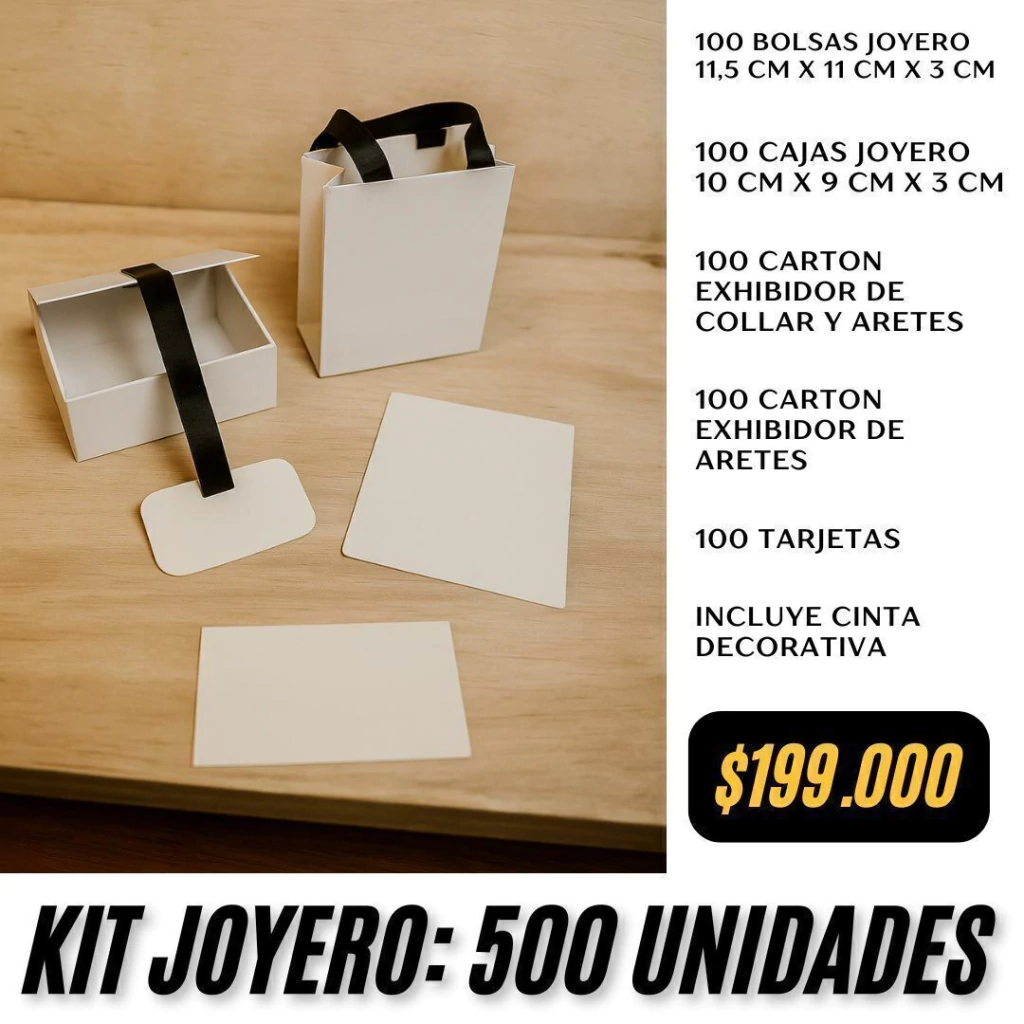 Este kit incluye: - 100 bolsas joyero de 11,5 cm x 11 cm - 100 cajas joyero de 10 x 9 x 3 cm - 100 cartones exhibidores para collar y aretes - 100 cartones exhibidores para aretes - 100 tarjetas