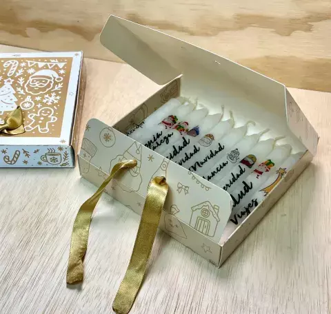 • 12 cajas con diseño navideño (15 cm x 15 cm x 3 cm), ideales para presentar tus velitas con estilo y atractivo visual.