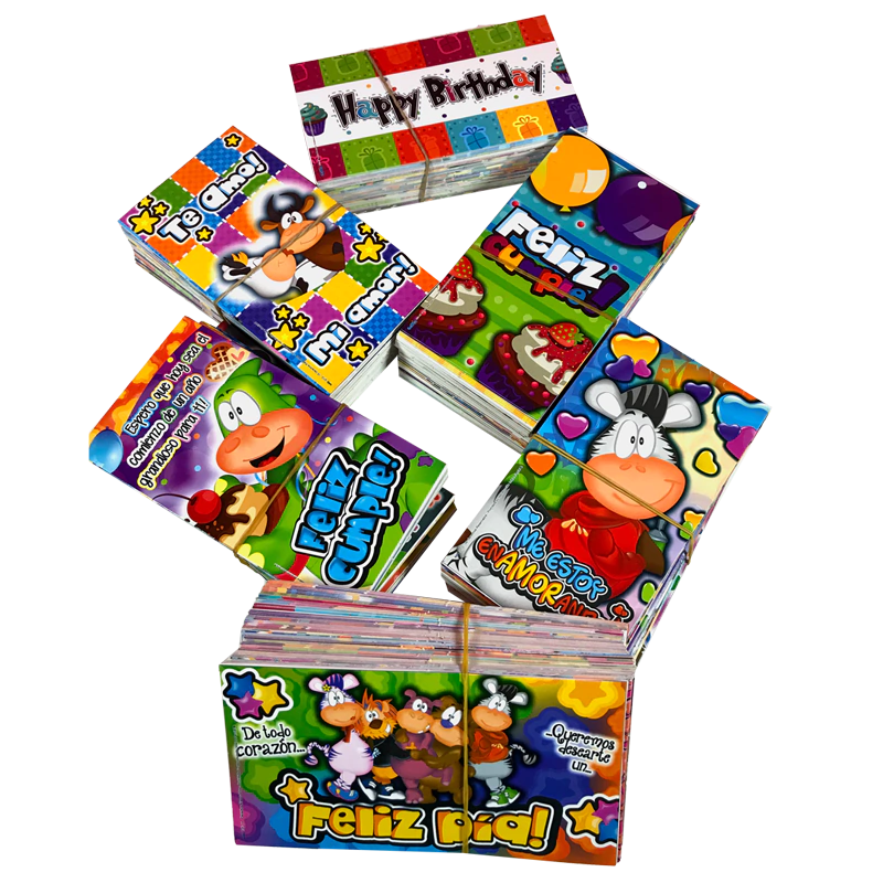 Vienen 100 tarjetas surtidas sujetas con una banda elastica